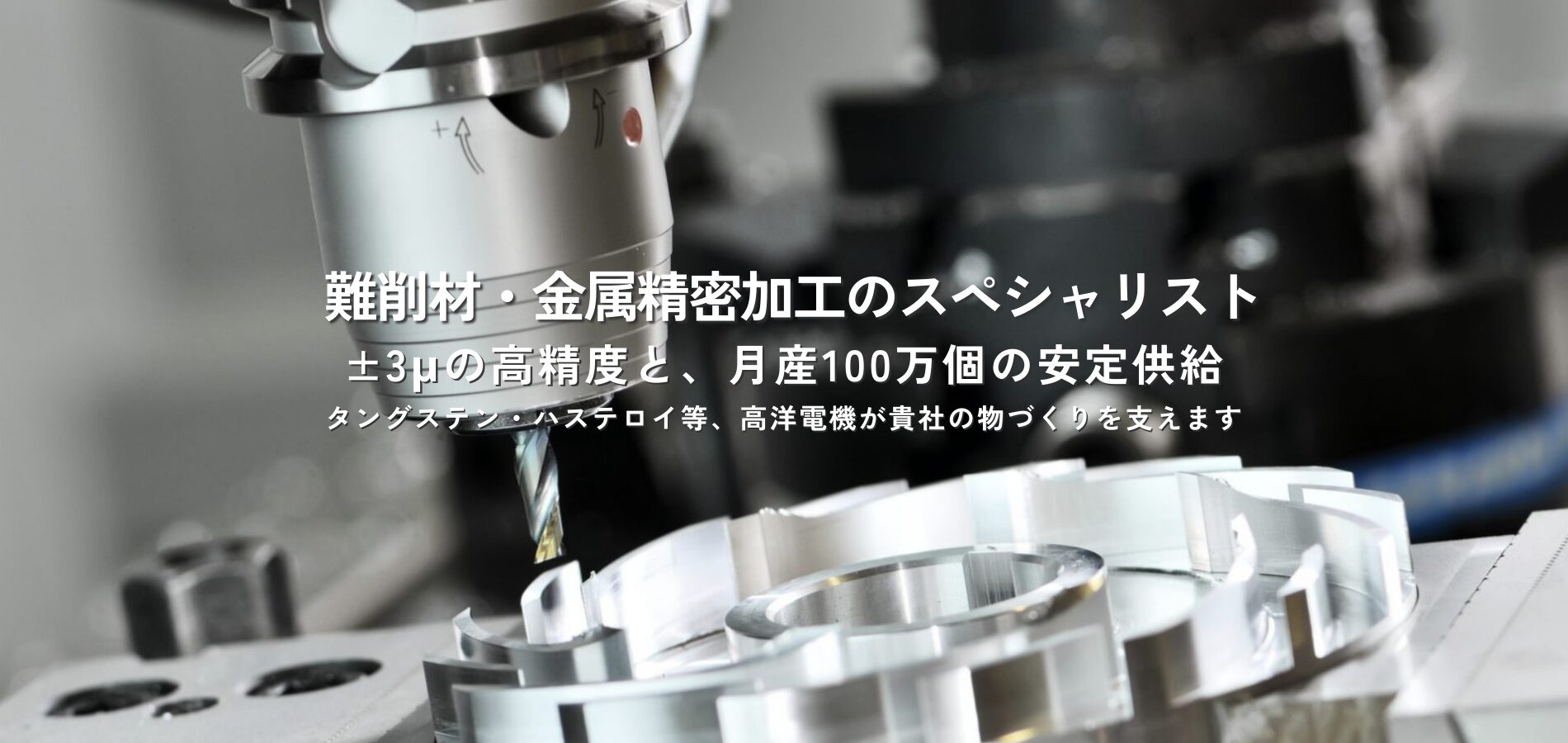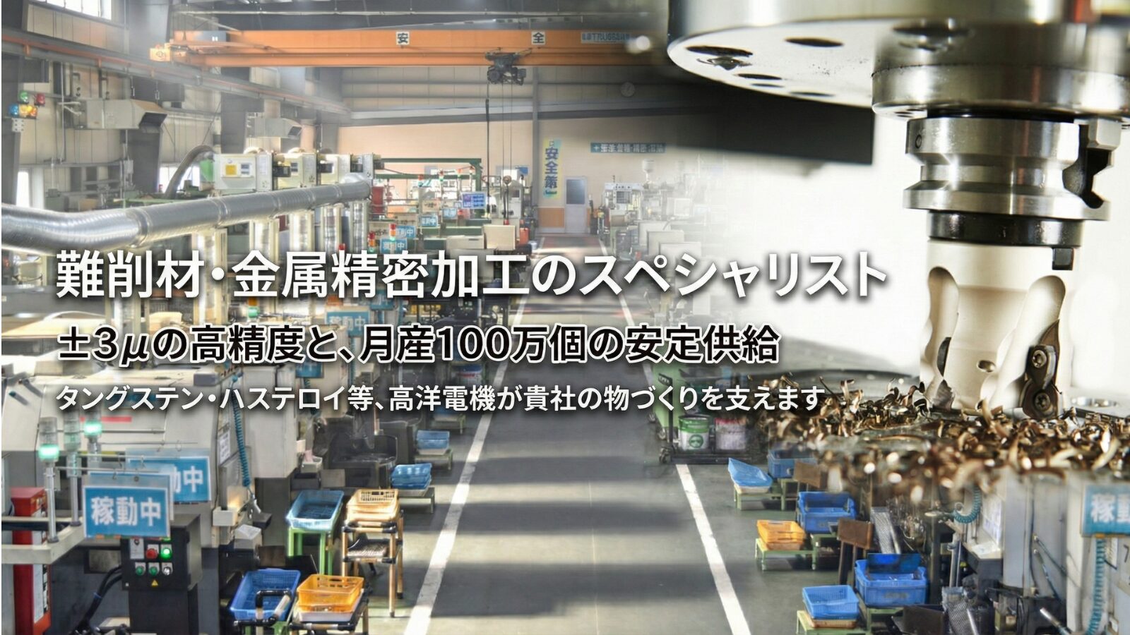 高洋電機は三重県に拠点を置く、機械・金属加工を中心とした会社です。プレス・アセンブリーを手がけるグループ会社もあり、切削加工を中心にさまざまな加工を組み合わせ、完成品までの一貫生産を行います。
